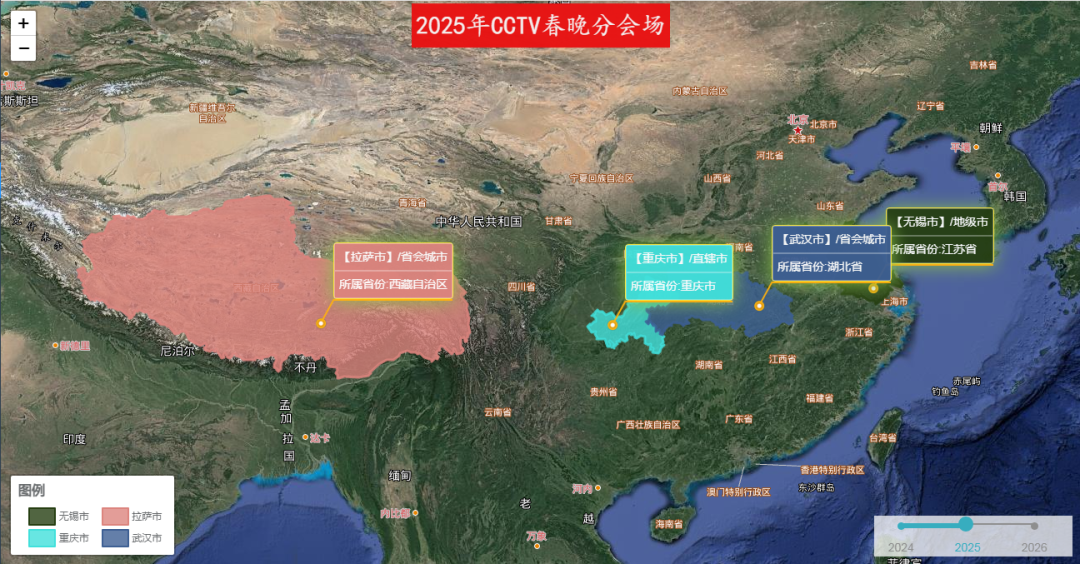 2025 年是乙巳蛇年,也是春节申遗成功后的首届春晚,分会场选址重庆、湖北武汉、西藏拉萨、江苏无锡,将主题升级为 “长江经济带 + 民族大团结”。