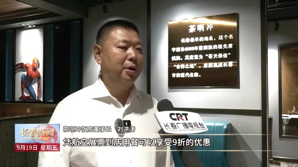 茶啊冲饭店董事长 刘洪涛:凭航空展票到店用餐可以享受9折的优惠,希望来自全国各地的朋友们能在我们店体验到东北特色美食和感受到我们长春人的热情招待。