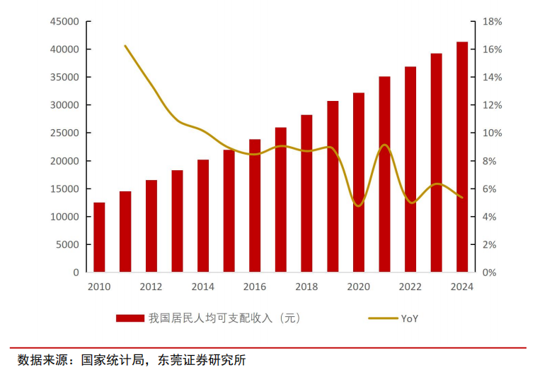 2010—2024 年我国居民人均可支配收入与增速(元,%)