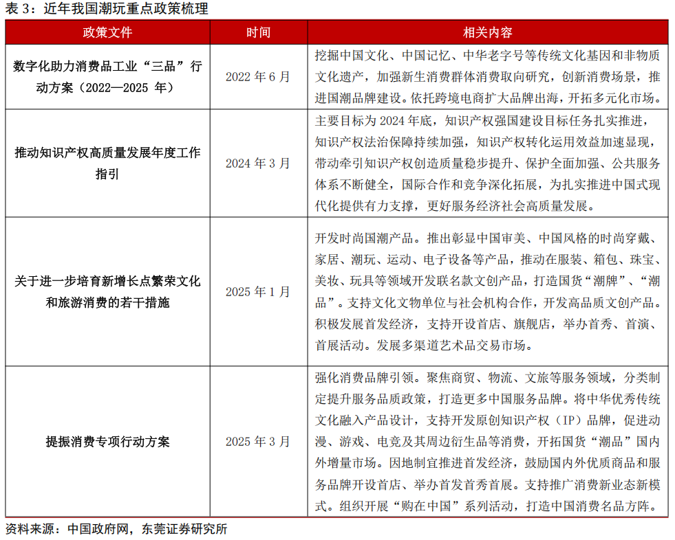 政策支持我国潮玩行业高质量发展。为进一步支持我国潮玩行业高质量发展,政府积极出台专项政策。2025 年 1 月,国务院办公厅印发《关于进一步培育新增长点繁荣文化和旅游消费的若干措施》,提出开发时尚国潮产品,推动在服装、箱包、珠宝、美妆、玩具等领域开发联名款文创产品,打造国货“潮牌 ”、“潮品 ”。此外,在今年 3 月中共中央办公厅、国务院发布的《提振消费专项行动方案》中,提到要强化消费品牌引领,将中华优秀传统文化融入产品设计,支持开发原创知识产权(IP)品牌,促进动漫、游戏、电竞及其周边衍生品等消费,开拓国货“潮品 ”国内外增量市场。国家出台的一系列支持政策为我国潮玩行业发展提供了坚实的政策保障。