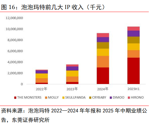 已形成 “一超多强 ”的 IP 矩阵格局。公司在全球范围内挖掘极具潜力的艺术家和设计师,已连续成功打造出多个广受青睐的潮流文化 IP 形象。对于各 IP 的独特表达与设计,采取差异化的运营策略,持续提升 IP 热度,积极推动 IP 商业化。2025 年上半年,公司共有 13 个艺术家 IP 收入过亿,其中 THE MONSTERS、MOLLY、SKULLPANDA、CRYBABY 和DIMOO 等五大 IP 营收 10 亿级以上,分别实现收入 48.14 亿元、13.57 亿元、12.21 亿元、 12.18 亿元和 11.05 亿元, 占比分别为 34.7%、9.8%、8.8%、8.8%、8.0%,合计占比达70%。THE MONSTERS 家族中的 LABUBU 凭借其独特的风格魅力跻身世界级 IP 行列,成为2025 年上半年全球最热门的 IP 之一。另外公司还有 HIRONO、星星人、HACIPUPU 等 8 个IP 营收超亿元,整体呈现“一超多强 ”格局。