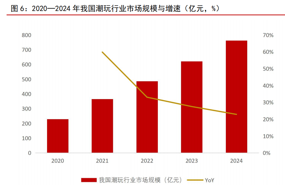 我国潮玩市场蓬勃发展。随着潮玩在全世界兴起,盲盒、手办等核心品类逐步走进大众视野并被消费者认可和接受, 目前已成为年轻人表达自我、社交互动的新载体,我国潮玩市场近几年蓬勃发展。根据中商产业研究院数据,我国潮玩市场规模从 2020 年的 229亿元增加至 2024 年的 763 亿元,年均复合增速为 35.11%。