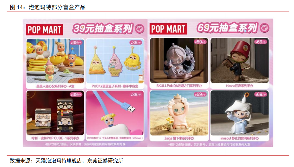 盲盒等创新营销的推动,增加潮玩产品复购率。以盲盒为例,盲盒的消费模式使消费者在每一次拆开包装前,都一定程度上伴随着对“ 隐藏款 ”和“热门款 ”的强烈期待。当消费者首次购买获得心仪款式时,会强化“下一次可能更惊喜 ”的认知;若未能如愿,会产生“弥补遗憾 ”的驱动力,促使其再次下单,形成“收集-缺失-再购买 ”的闭环。
