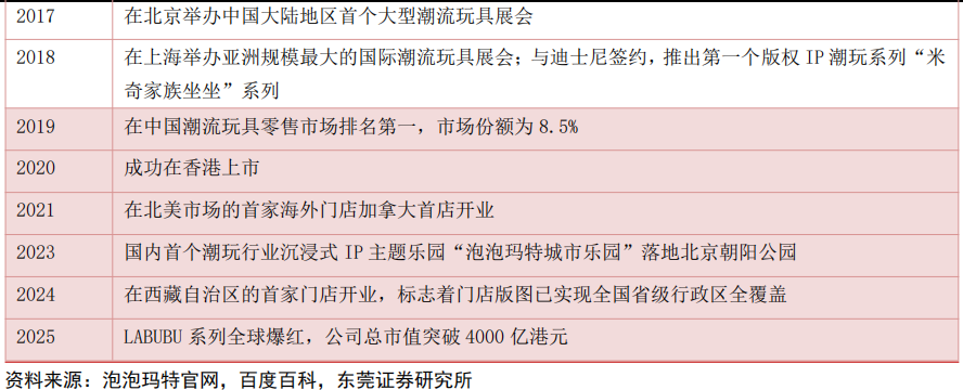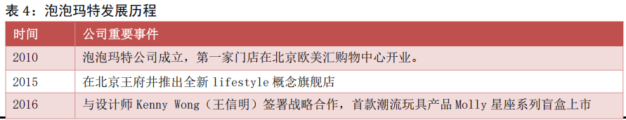 公司已成长为潮玩行业龙头。公司成立于 2010 年,是中国潮玩行业的开创者。经过十多年的发展,公司从早期的潮流商品集合店逐步转型为潮玩行业全产业链综合运营平台商,目前主营业务主要围绕全球艺术家挖掘、IP 孵化运营、消费者触达、潮玩文化推广、创新业务孵化与投资等五个领域展开。公司通过推进“IP 孵化+全渠道+全球化 ”战略,逐步成长为市值超 4000 亿港元的潮玩龙头。