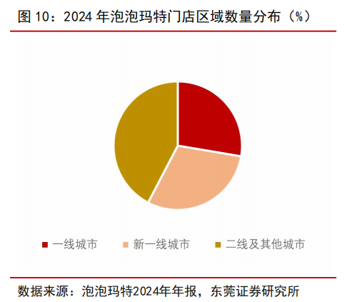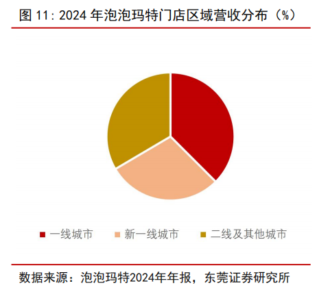 一线与新一线城市是泡泡玛特收入的主要来源。 以泡泡玛特为例,从 2024 年泡泡玛特门店区域数量分布来看,一线与新一线城市分别为 747 家与 810 家, 占比分别为 28%与30%。考虑到一线城市消费者的消费能力相对较强,一线城市 2024 年为泡泡玛特贡献的营收占比为 38%。