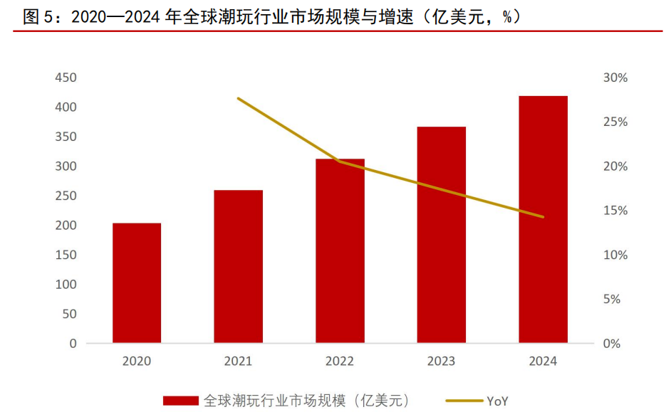 全球潮玩市场规模近几年呈增长态势。潮玩文化凭借其独特的 IP 魅力、个性化表达以及收藏属性,打破了地域与年龄的界限,近几年全球潮玩市场规模增速均维持双位数增长。根据中商产业研究院数据,2020—2024 年全球潮玩行业市场规模从 203 亿美元增加至 418 亿美元,年均复合增速将近 20%。