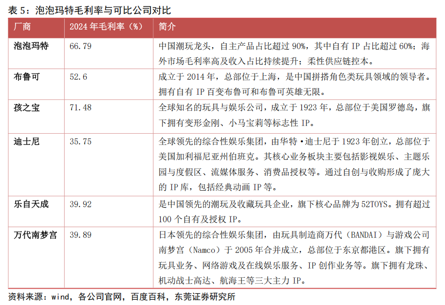 公司毛利率较为领先。得益于优秀的 IP 运营能力,公司毛利率在潮玩行业中处于较为领先的地位。公司 2024 年毛利率 66.79%,显著高于同期的布鲁可、迪士尼、乐自天成、万代南梦宫等。这主要得益于:其自主产品占比超过 90%,其中自有 IP 占比超过 60%;海外市场毛利率高及收入占比持续提升;柔性供应链控本。相比而言,其他公司如旗下IP 中以授权 IP 为主而自有 IP 占比较低,则需支付高额授权费从而导致毛利率低于泡泡玛特。
