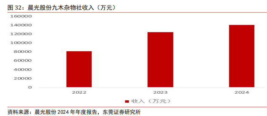 持续推进 IP 战略。公司积极布局年轻人喜爱的 IP 与二次元产品。奇只好玩作为公司旗下独立潮玩品牌,以自主 IP 孵化、IP 运营、品牌联合开发、潮玩衍生为核心经营模式,关注年轻消费者的情绪价值和价值主张,积极布局“二次元 IP ”领域。通过自主 IP 孵化和与国内外热门 IP 合作相结合的方式进行 IP 产品矩阵的深度运营。渠道方面,奇只好玩线下依托九木杂物社、传统校边店,线上依托天猫、抖音、小红书等平台展开销售。公司大力拓展九木杂物社线下渠道数量,门店在产品组合、精细化运营以及消费者洞察及服务等方面继续提升,形成持续的人、货、场检核机制。线上业务多渠道发展,天猫、拼多多、抖音、社区电商、即时零售等新型渠道均有提升。截至 2024 年末,公司在全国拥有九木杂物社 741家,2025 年将继续保持 100 家以上的开店速度,将加强 IP 类产品资源投入和自有品牌占比,不断丰富产品结构,促进收入保持较快增长。2022—2024年九木杂物社收入由 8.13 亿元增长至 14.06 亿元,CAGR 约为 31.5%。