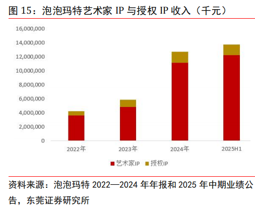 公司艺术家 IP 与授权 IP 均保持快速增长。公司旗下 IP 分为艺术家 IP 和授权 IP。其中艺术家 IP 包括自有 IP 和独家 IP,是公司主要商品类型,主要包括 THE MONSTERS、MOLLY、 SKULLPANDA、CRYBABY 等。2025 年上半年,公司艺术家 IP 实现收入 122.29 亿元,同比增长 231.6%;收入占比上升至 88.1%,同比提高 7.1 个百分点。授权 IP 方面,2025 年上半年,授权 IP 实现收入 15.25 亿元,同比增长 119.4%,主要得益于公司不断加深与更多版权方的合作,持续扩大 IP 授权区域,同时推出更多风格、种类的产品。