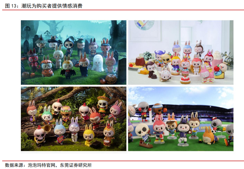 情感化共鸣,激发潮玩增长潜力。 目前,消费者愈发追求精致的生活方式,在消费过程中不仅重视产品的质量,更看重其所能带来的情感满足感。潮玩作为一种非刚需的文化消费产品,其价值不仅在于造型设计、稀缺性等物理属性,更在于能否与消费者建立深层情感连接,进而满足消费者自我表达、情感陪伴、社交联结等深层需求,让消费者对潮玩产生购买欲望,进而激发潮玩的增长潜力。