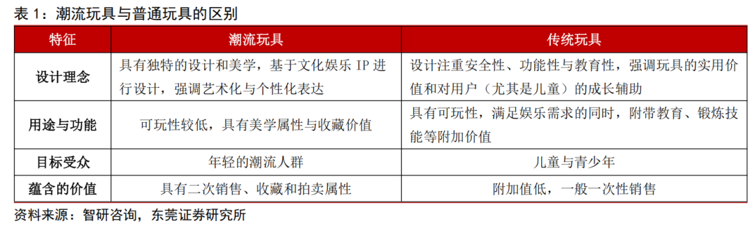 潮流玩具区别于传统玩具,更强调艺术与个性化表达。潮流玩具是将潮流文化与相关内容巧妙融合的一类玩具。它与传统玩具不同,潮流玩具大多凭借独特的设计和出众的美感来吸引消费者,并且多数是基于授权的潮流内容创作而成,强调美学属性和收藏价值,具有二次销售、收藏和拍卖等属性。