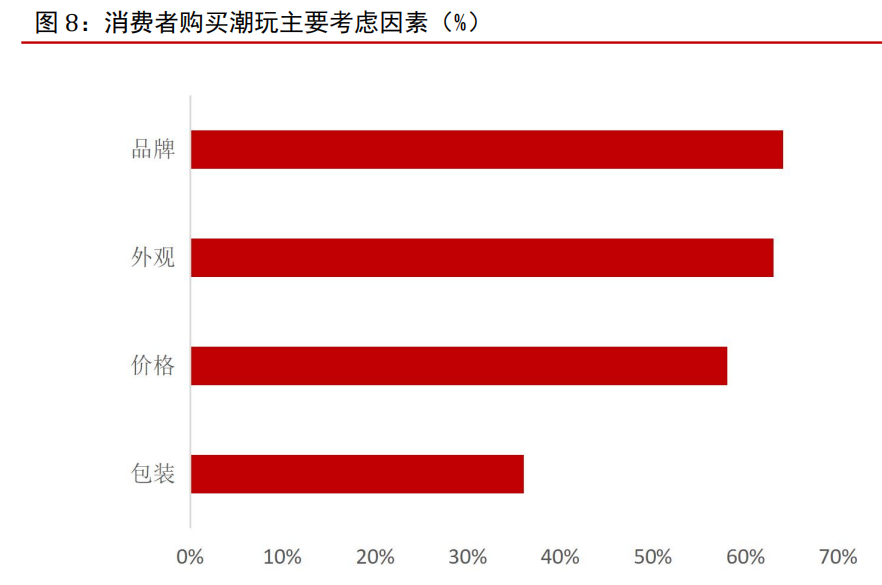 我国潮玩市场龙头企业市场份额有提升空间。随着潮玩市场发展,行业逐步从产品组合有限的阶段向品类多元化、设计精细化、品牌高端化等方向转型。根据研精毕智信息咨询数据, 目前在消费者购买潮玩过程中,首要考虑因素为品牌。该现象或主要与品牌知名度、市场认可度、产品质量、产品多元化等因素有关。因此,在龙头品牌在市场渗透率进一步提高的背景下,我国潮玩市场龙头企业市场份额存在提升空间。