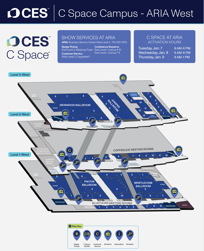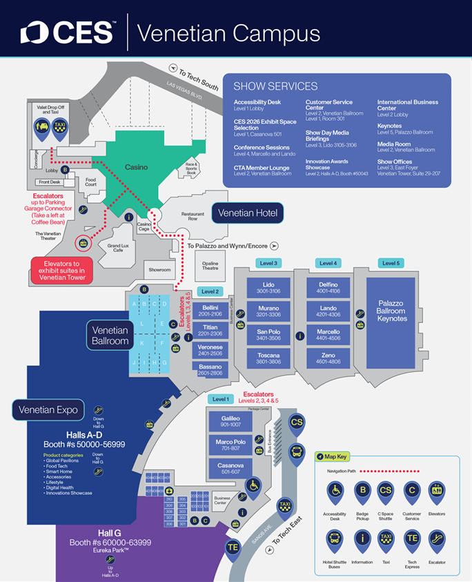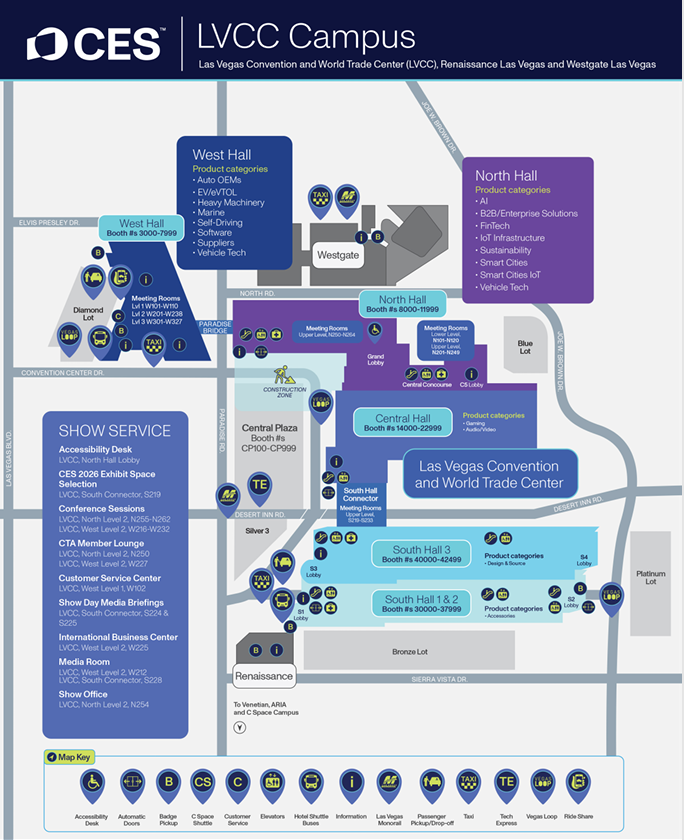 分为 Central Hall、South Hall、West Hall、Tech East 等区域,分别聚焦消费电子核心品类展示