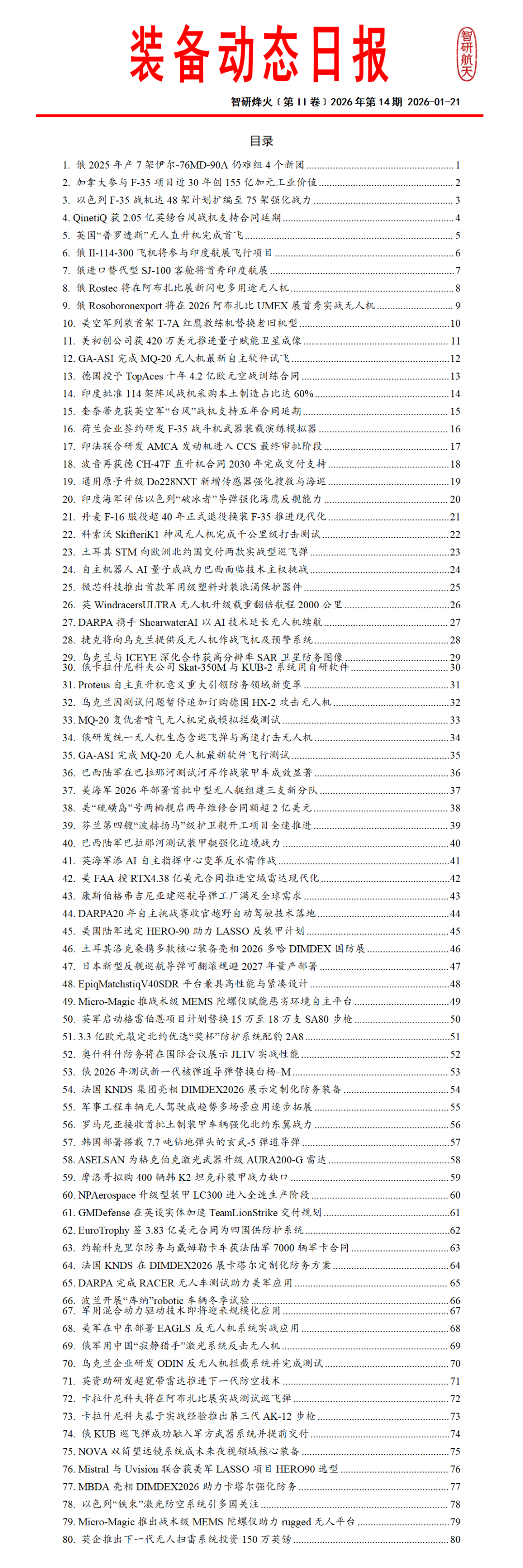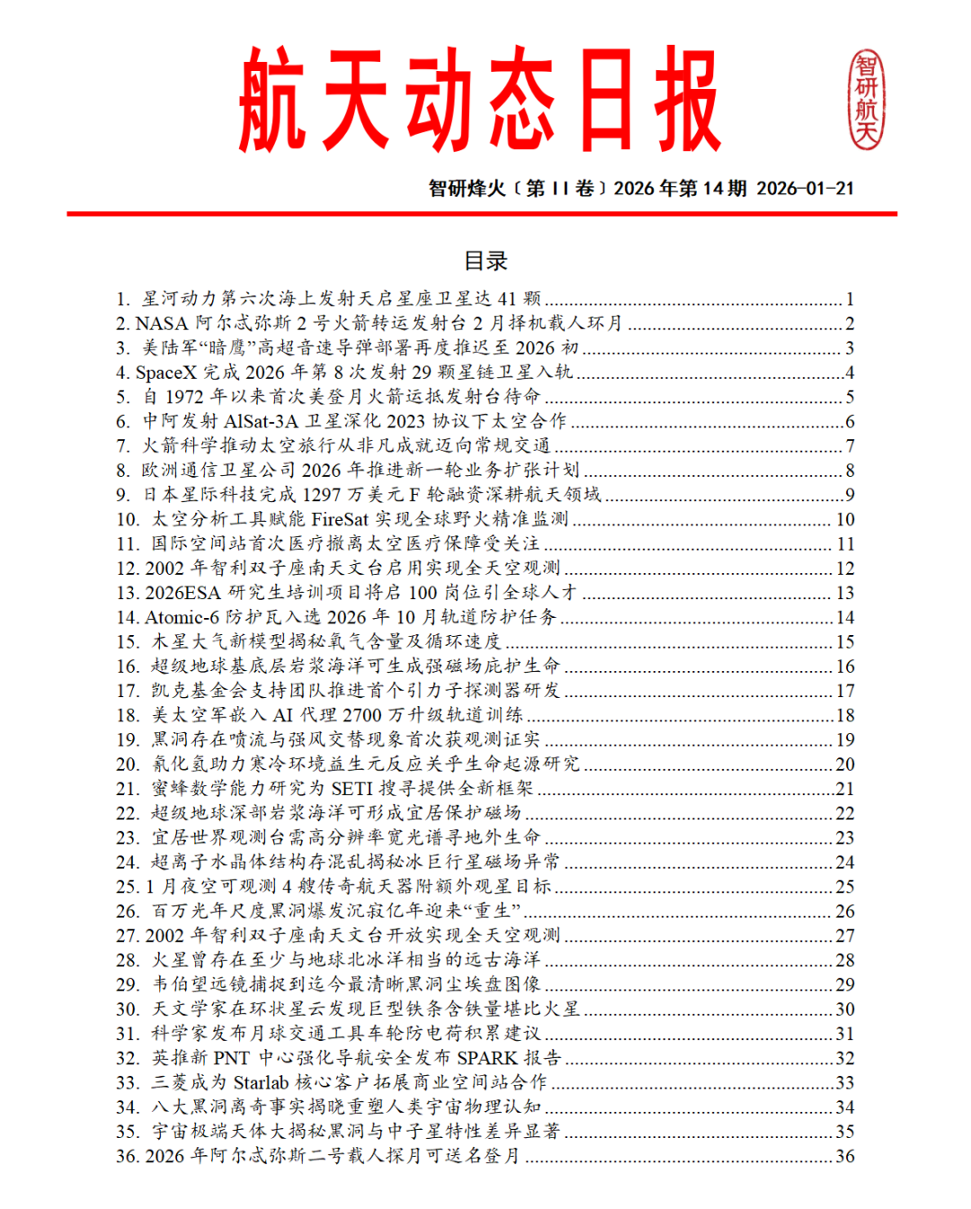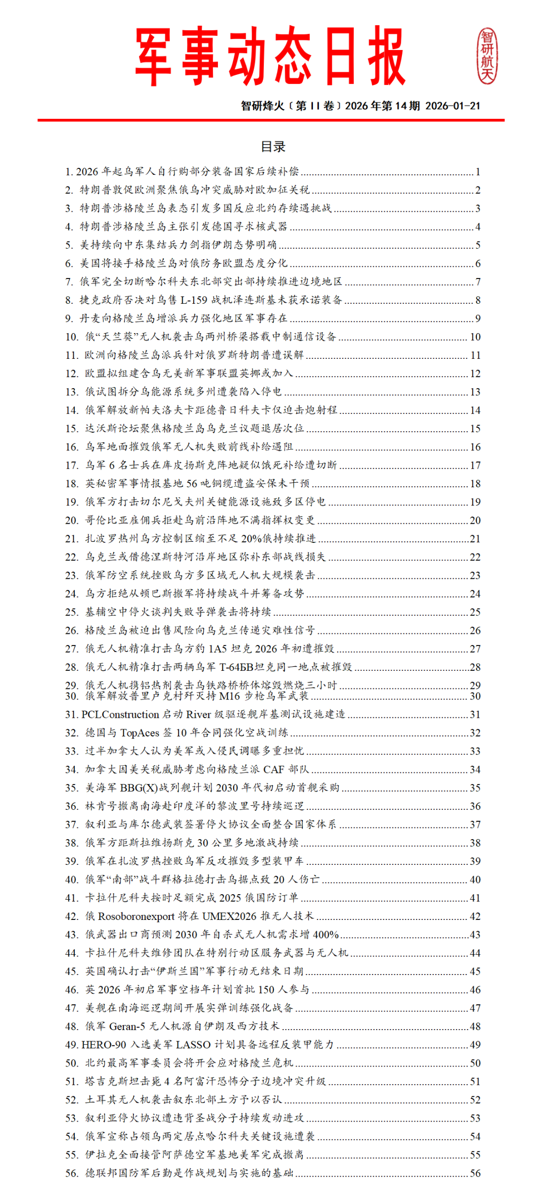 《全球防务动态》系列专刊国内独家每日发布涵盖航天领域、武器装备、军事热点、人工智能、先进制造等领域的全球动态信息。提供“航天动态专报”、“装备动态专报”、“军事动态专报”、“智造动态专报”以及“航天防务新闻日报”等特色产品模块。工作日每日推送,形成结构化、可编辑的文档,供订阅用户在小程序“智研烽火信息”商城下载。每日及时的动态信息能够有力支持各单位进行要讯报送、军情研究与安全形势分析的需求。