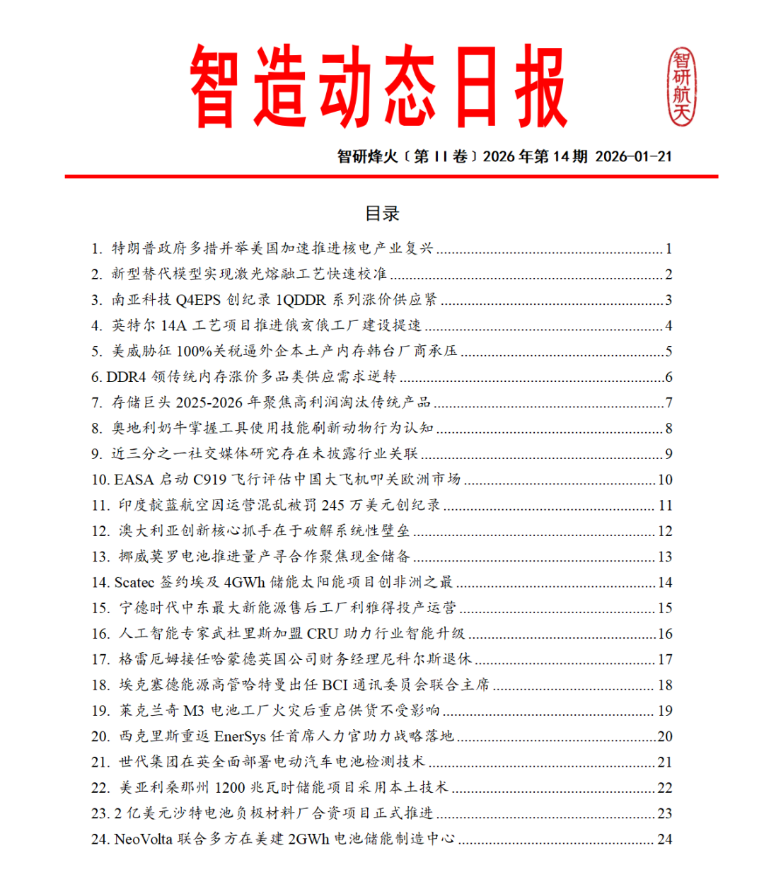 聚焦全球智能制造领域的权威情报产品,每日精选航空技术与应用、人工智能、工业机器人、增材制造、芯片工艺等核心技术突破与产业动态,以结构化、可编辑的文档形式呈现。内容涵盖技术解析、企业战略及政策影响,依托资深专家团队及强大的开源情报处理能力,助力企业快速捕捉技术趋势与市场机遇,把握智造脉搏,引领产业升级。