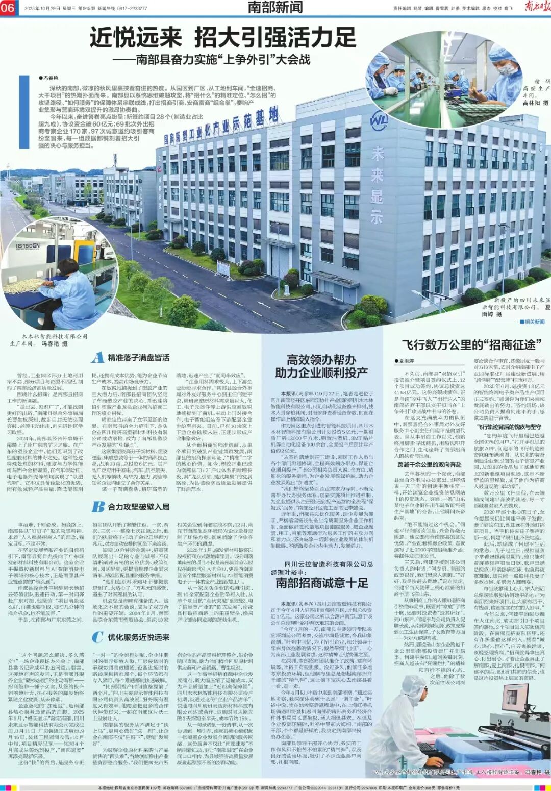 一个优质项目的落地能激活整条产业链活力,四川精研高塑项目便是生动例证——该项目2025年1月破土、3月试产,以60天“破茧成蝶”的“产业闪电战”,彰显了南部的招商实力与攻坚效能。为保障项目快速落地,联动经开区专班半月内清退低效项目、盘整93亩空地并备好规划图,项目破土当日服务专班全程代办工商注册、选址等手续,次日推送招工名单,同步协同电力部门20天完成4000千瓦变压器安装,创下远超行业3个月常规工期的“电力奇迹”。四川未来显示智能科技有限公司