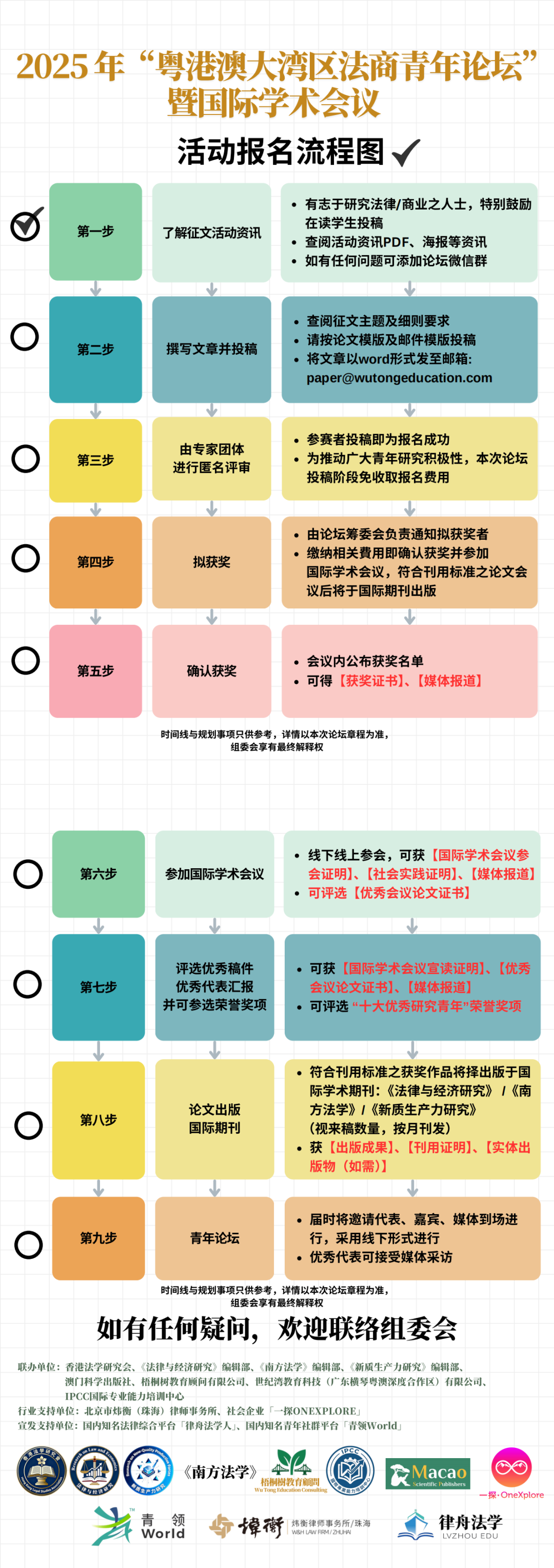 梧桐树教育自成立以来,在社会各界的深切关怀与大力支持下,依附于「引路人」的理念以及青年发展与社会责任深度融合责任,我们致力于打造法商青年社群、构建能够在区域与全球格局中实现卓越的职业发展平台,至今已取得了一定的成果。为深入贯彻落实全面依法治国的战略部署,汇聚青年专业智慧,发出青年声音,梧桐树教育联合各大单位正式启动【2025年“粤港澳大湾区·法商青年论坛”暨国际学术会议】活动,诚挚邀请您赐稿本次征文活动,为社会提供青年声音,为国家建设建言献策,为“法商”领域创新发展提供理论基础。期盼您能拨冗加入,随函附上相关材料,敬请垂览。