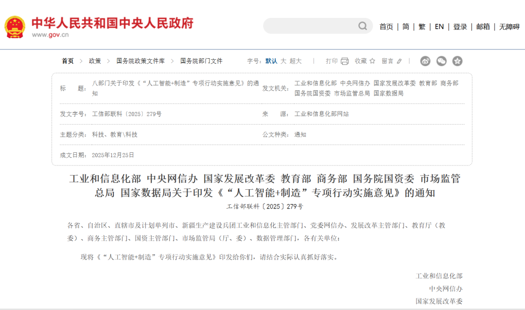 《关于加快推进“人工智能+制造”发展的指导意见》:作为行业纲领性指引,明确提出突破算力芯片、工业大模型等“卡脖子”技术,推动AI与制造业全流程融合;目标到2027年培育2-3家全球生态主导型企业,打造100个“AI+制造”示范工厂。 《关于培育数据流通服务机构 加快推进数据要素市场化价值化的意见》:提出培育三类数据流通服务机构,2026年建成10个国家级标杆数据集,为工业AI应用提供高质量数据支撑,破解训练数据供给不足的痛点。 《“人工智能+制造”专项行动实施意见》:进一步细化融合目标,计划到2027年推广500个典型应用场景,推动工业互联网与AI深度融合,提升制造业全要素智能化水平。