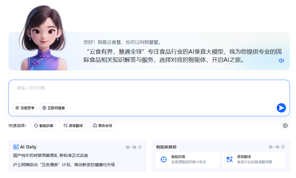 云食界联合商务部国际贸易经济合作研究院、中国食品土畜进出口商会等高校科研机构,创新研发全球首个食品贸易垂直AI大模型"云食慧"。该系统基于120多个国家产业数据库和18大类食品分类标准,依托海量贸易数据训练,构建覆盖供需智能匹配、合规审查、智能报关等12个核心环节的智能决策系统,实现多种语言实时互译、全球各国法规动态解析能力,并通过自动生成贸易可行性报告、智能推荐物流方案,跨境订单撮合交易系统,赋能行业企业数字化升级,致力打造云食慧为食品贸易领域首个国家级AI大模型应用示范平台。