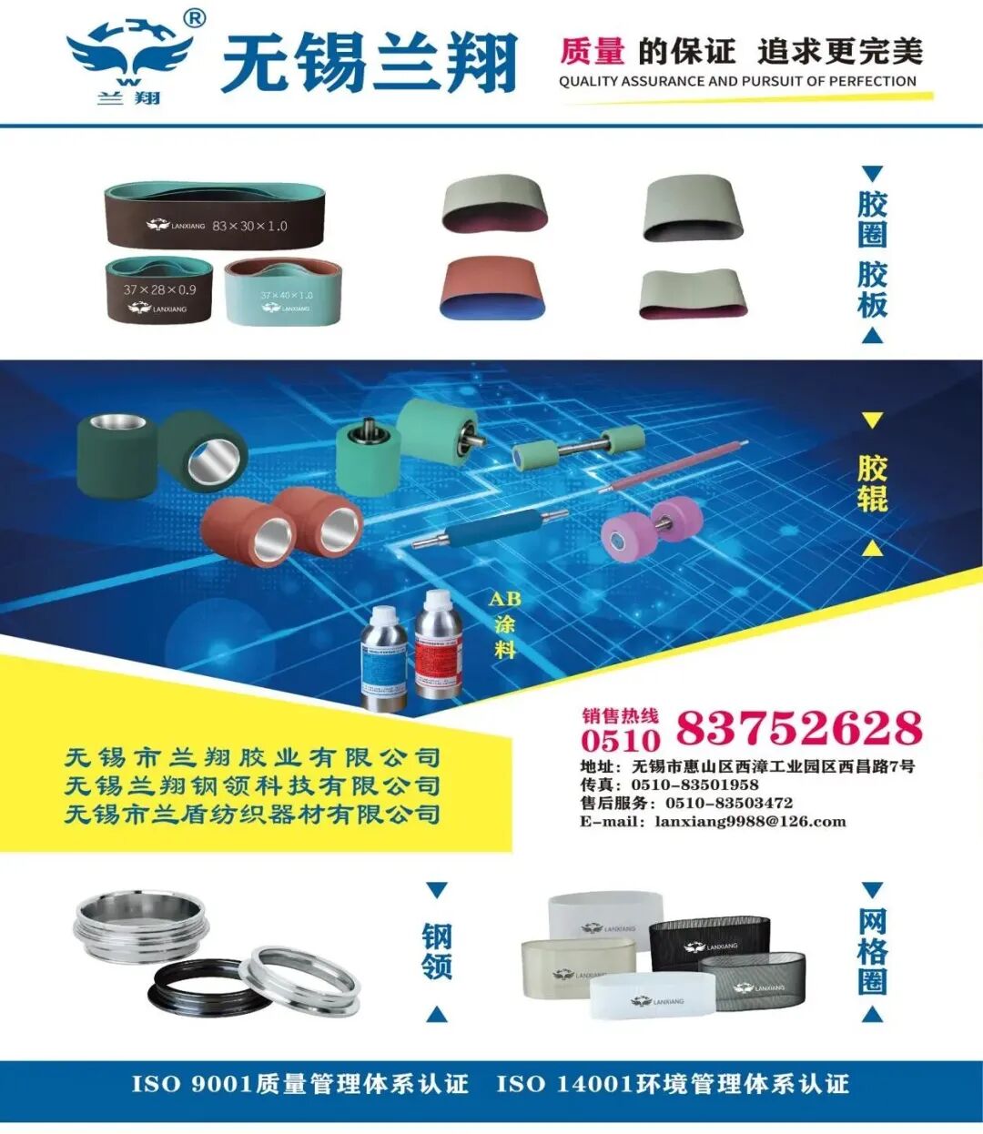 无锡市兰翔胶业有限公司坐落于吴文化发源之地、素有“太湖明珠”美誉的无锡市。自1994年创立以来,公司深耕纺织器材领域,已从一家专业生产厂发展壮大为拥有多家子公司的综合性集团企业。旗下汇聚无锡兰翔钢领科技有限公司、无锡市兰盾纺织器材有限公司、六安翔龙胶业有限公司、安徽兰翔纺机科技有限公司等实体,形成了覆盖从核心元件到成套技术的完整产业链,彰显了雄厚的研发、生产与综合服务实力。