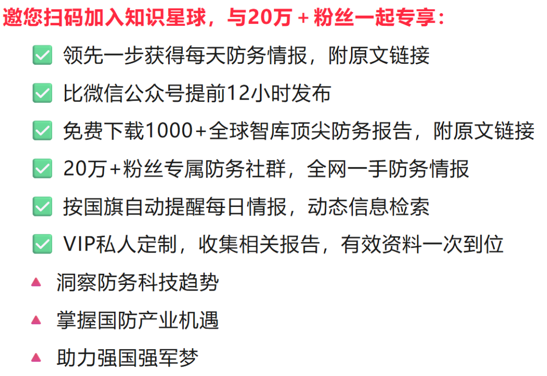 免责声明:本公众号【防务硬科技】及关联知识星球【亚太防务科技】内所有资源均来源于互联网公开渠道,仅限用户个人学习、研究与交流使用,不涉及任何商业目的或销售行为,内容观点不代表我们立场。相关资源版权归原作者或出版方所有,如权利人认为存在侵权,请提供权属证明并与我们联系,我们将立即核实并删除处理。用户支付的会员费用仅用于资料收集、整理与平台运营维护等必要成本支出。我们尊重知识产权,并支持用户通过正规渠道购买正版作品。