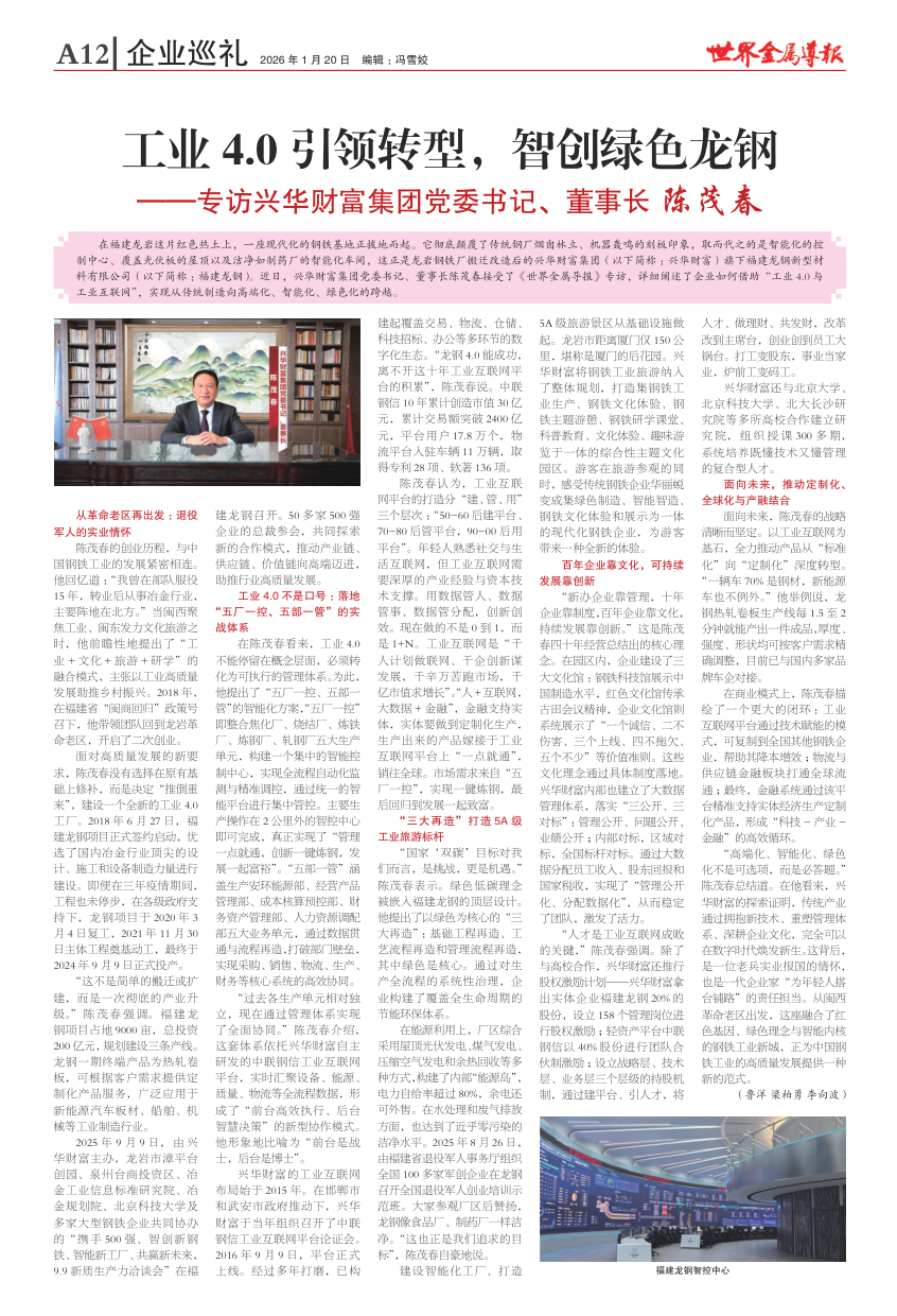 在福建龙岩这片红色热土上,一座现代化的钢铁基地正拔地而起。它彻底颠覆了传统钢厂烟囱林立、机器轰鸣的刻板印象,取而代之的是智能化的控制中心、覆盖光伏板的屋顶以及洁净如制药厂的智能化车间,这正是龙岩钢铁厂搬迁改造后的兴华财富集团(以下简称:兴华财富)旗下福建龙钢新型材料有限公司(以下简称:福建龙钢)。近日,兴华财富集团党委书记、董事长陈茂春接受了《世界金属导报》专访,详细阐述了企业如何借助“工业4.0与工业互联网”,实现从传统制造向高端化、智能化、绿色化的跨越。