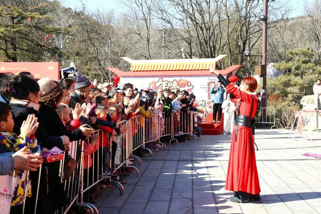 模式口公园舞台开展剧情式民俗表演人气爆棚,村长李雅轩带领村民们寻三宝、逐夕兽、迎新春,游客踊跃参与,亲身感受民俗魅力,鼓声、幡旗、醒狮展演轮番上演,创新演绎传统文脉,点燃现场氛围,赢得阵阵喝彩;