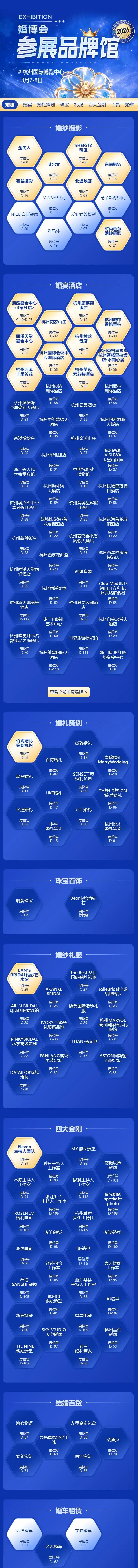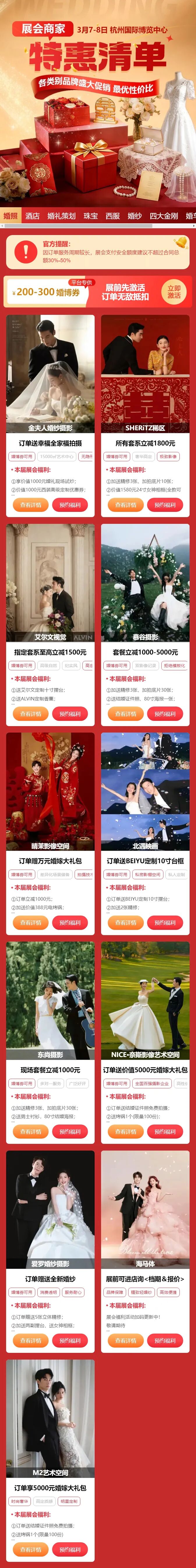 杭州婚博会展会品类:婚纱照、婚宴酒店、婚庆婚礼策划、四大金刚、婚戒三金五金、婚纱礼服、新郎西装、喜糖喜酒伴手礼、新婚家纺、婚车租赁全都有,现场挑选、谈单、订单一站式全搞定!