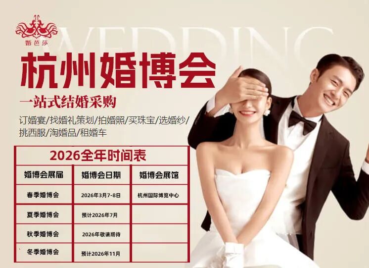 2026春季杭州婚博会将于3月7-8日地点在杭州国际博览中心再次举办,杭州婚博会严选3000多个全球大牌,国内外名牌名品齐聚,潮品新品云集,珠宝、婚照、婚纱、礼服、婚品、酒店、婚庆…一站式备齐结婚所有!结婚,你要的大牌商家都在这里,还能省下不少钱哦,杭州在备婚的小情侣,一定不要错过哦!