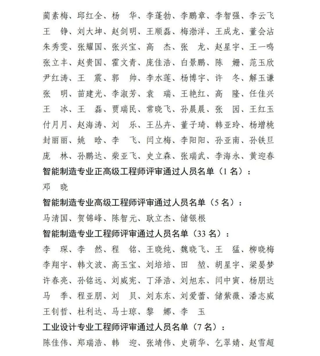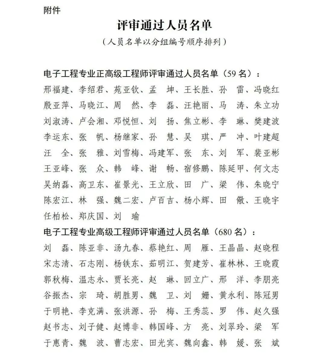 经河北省电子工程、智能制造、工业设计专业高级综合评审委员会和中级综合评审委员会评审,邢福建等59名同志通过电子工程专业正高级工程师任职资格评审,刘磊等680名同志通过电子工程专业高级工程师任职资格评审,赵天顺等182名同志通过电子工程专业工程师任职资格评审;邓晓同志通过智能制造专业正高级工程师任职资格评审,马清国等5名同志通过智能制造专业高级工程师任职资格评审,李琛等33名同志通过智能制造专业工程师任职资格评审;陈佳伟等7位同志通过工业设计专业工程师任职资格评审。按照《河北省职称评审管理办法》要求,现将评审通过名单予以公示。在公示期内,对公示对象有异议的单位、个人均可通过书面、电话等形式向省工业和信息化厅人事教育处反映(信函以到达日邮戳为准)。