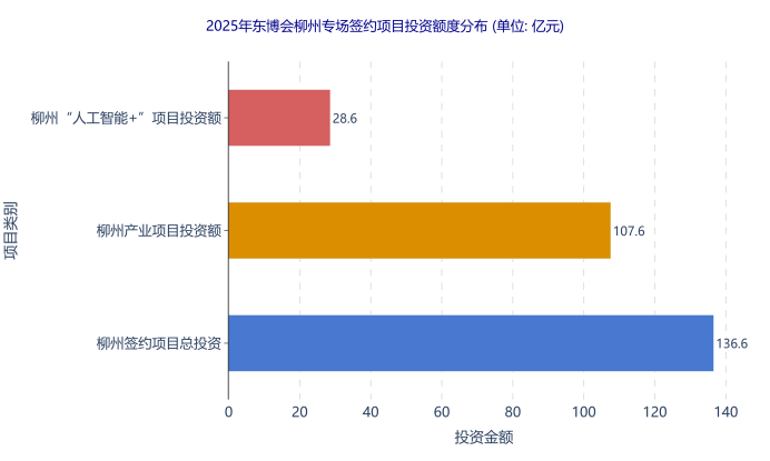 “人工智能+”赋能千行百业项目占总签约项目的28.4%,是本次展会的重点领域之一。柳州市专场签约的“人工智能+”项目总投资达28.59亿元,占当地产业项目总投资的26.6%。