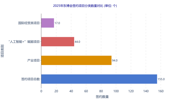 在第22届中国—东盟博览会现场签约仪式上,共有155个项目成功签约。其中产业项目94个,“人工智能+”赋能千行百业项目44个,国际经贸类项目17个。