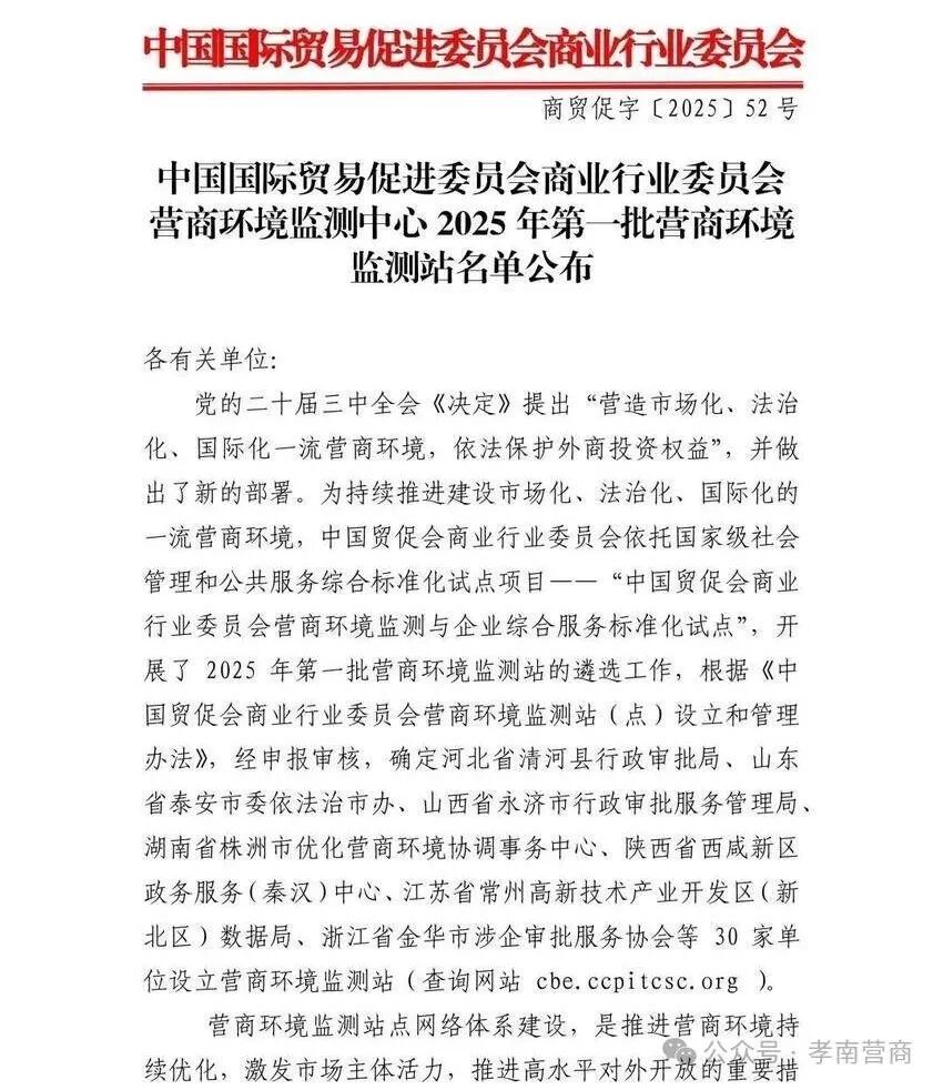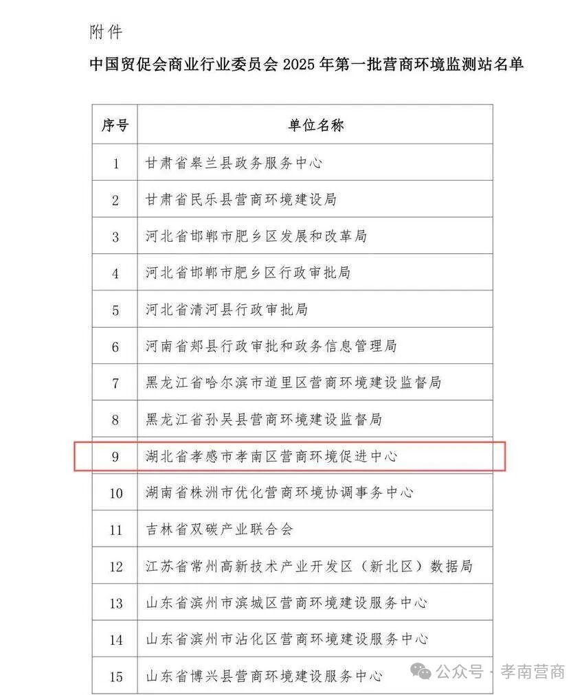 2月19日,中国国际贸易促进委员会商业行业委员会公布了2025年第一批营商环境监测站名单,孝南区营商环境促进中心入选,为本次湖北省唯一入选县市区。湖北首衡城农产品有限公司、湖北港荣食品有限公司、湖北爽露爽食品股份有限公司、铭冠(湖北)包装材料有限公司等30家企业入选营商环境观测点。