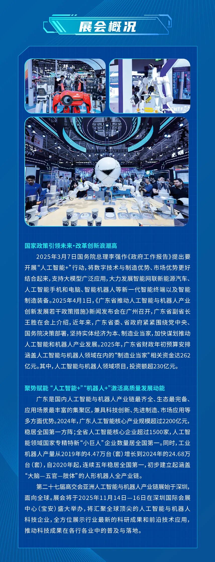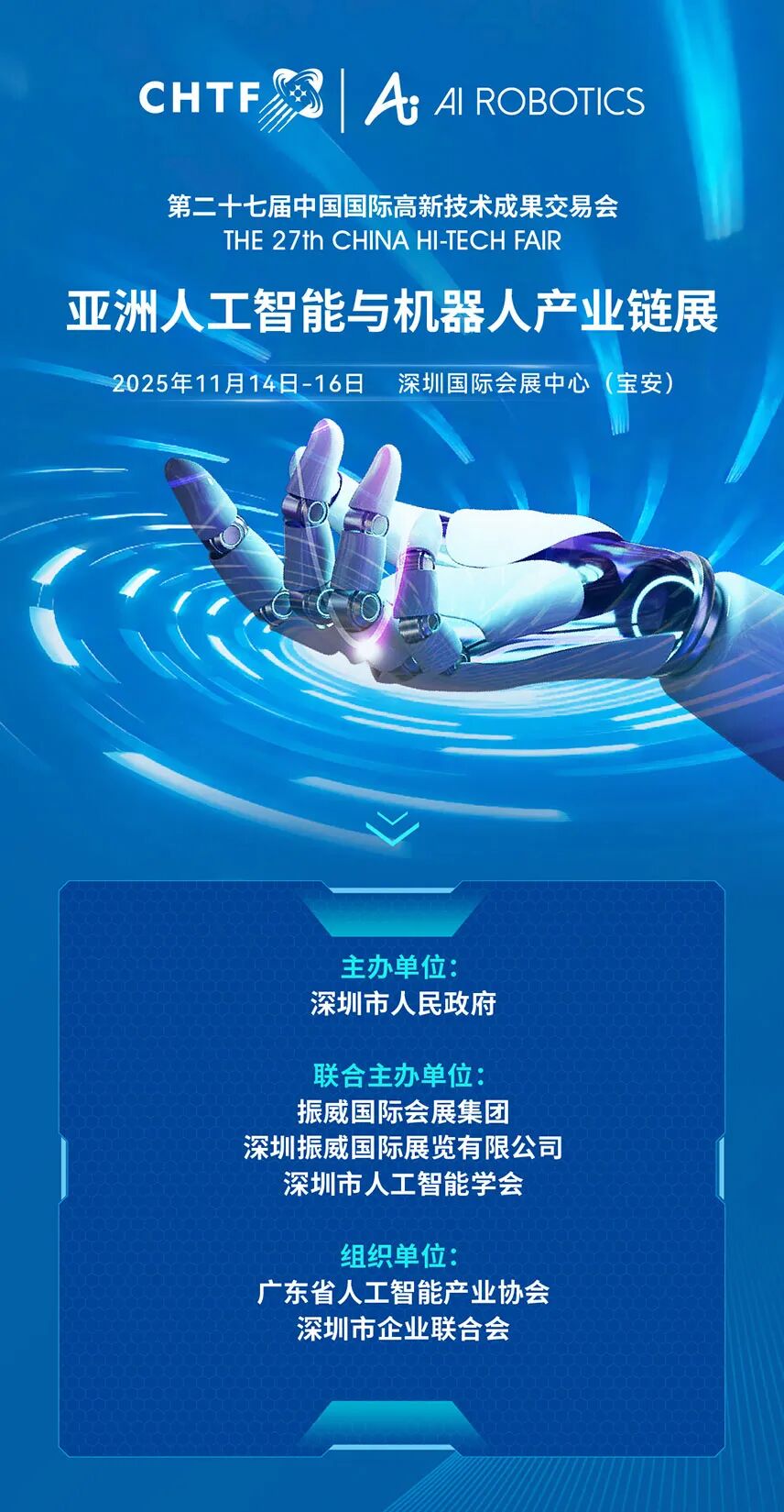高交会亚洲人工智能与机器人产业链展超6万平米,聚焦“AI+机器人”全产业链,特别设立“具身智能展区”“人工智能集成应用”等十大主题展区,1000余家行业巨头将参展参会,集中展示工业机器人、服务机器人等前沿成果,已成为人工智能与机器人技术商业化、产业化的核心试验田、全球AI领域的“风向标”,和全球人工智能领域最具影响力的行业盛会。