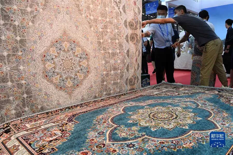 9月10日,在第18届中国—东盟博览会现场,参会者在了解巴基斯坦地毯。新华社记者 马宁 摄