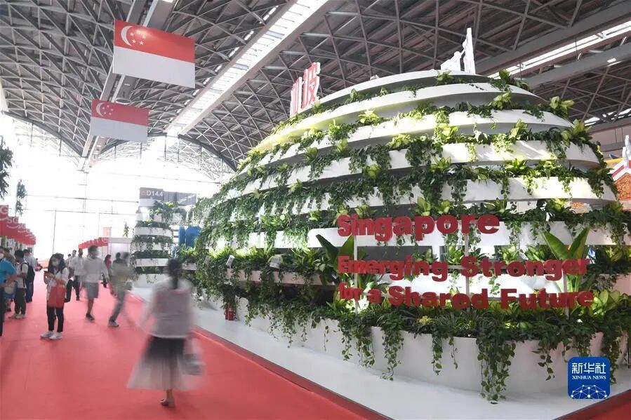 9月11日,在第18届中国—东盟博览会现场,参会者在新加坡馆参观。新华社记者 周华 摄