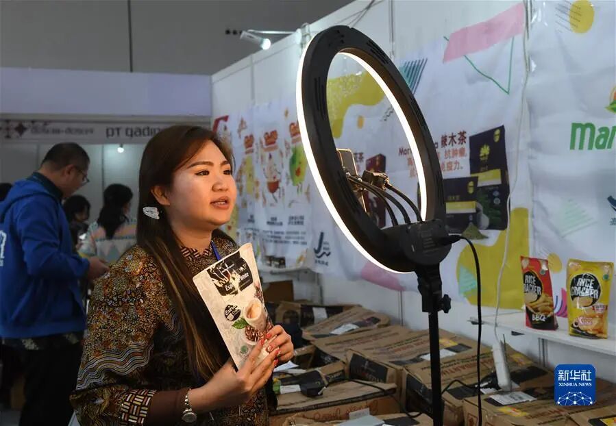 参展商在第17届中国—东盟博览会上通过网络直播推销商品(2020年11月27日摄)。新华社记者 陆波岸 摄