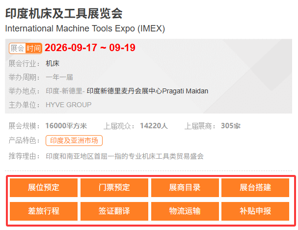 印度机床及工具展览会International Machine Tools Expo (IMEX)【展位预定、门票预定、展商目录、展台搭建、差旅行程、签证、翻译、物流运输、补贴申报】