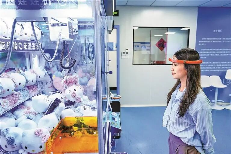 戴上"金箍圈"后,仅凭意念就能操控抓娃娃机夹起玩偶。 本组图片由深圳晚报记者 严文婷 摄