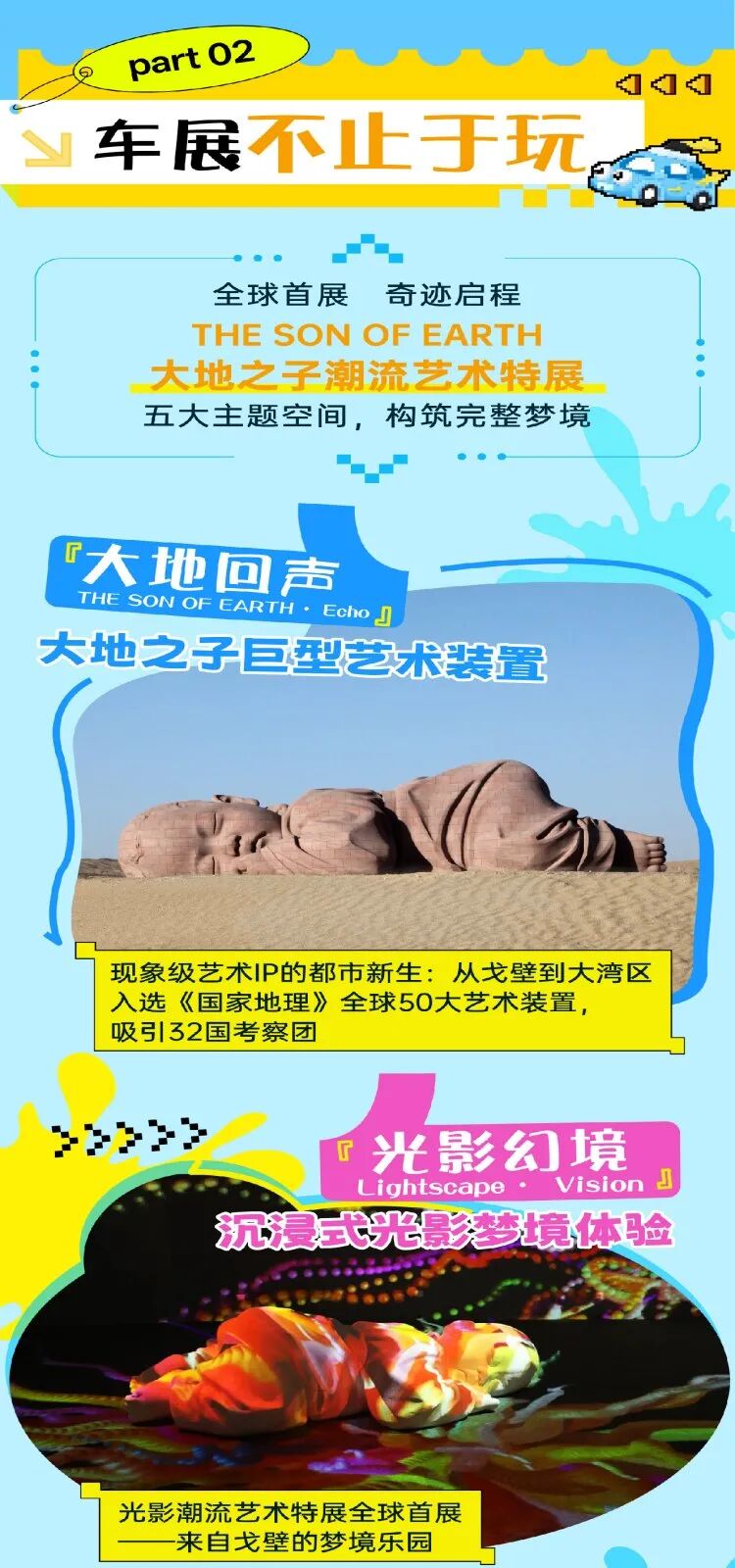 “大地之子”艺术IP的引入,进一步拓展了车展的文化内涵与经济外延。该作品由清华大学董书兵教授创作,曾入选《国家地理》全球50大艺术装置,全网曝光超25亿次,具备极强的文化号召力和公众影响力。本次它以完整光影艺术特展的形式亮相,打造五大主题梦境展区,不仅提升了车展的艺术层次,更通过限量珍藏品、盲盒、艺术咖啡等文创产品,形成“艺术-消费-体验”闭环,有效延伸产业链条,带动文化消费升级。