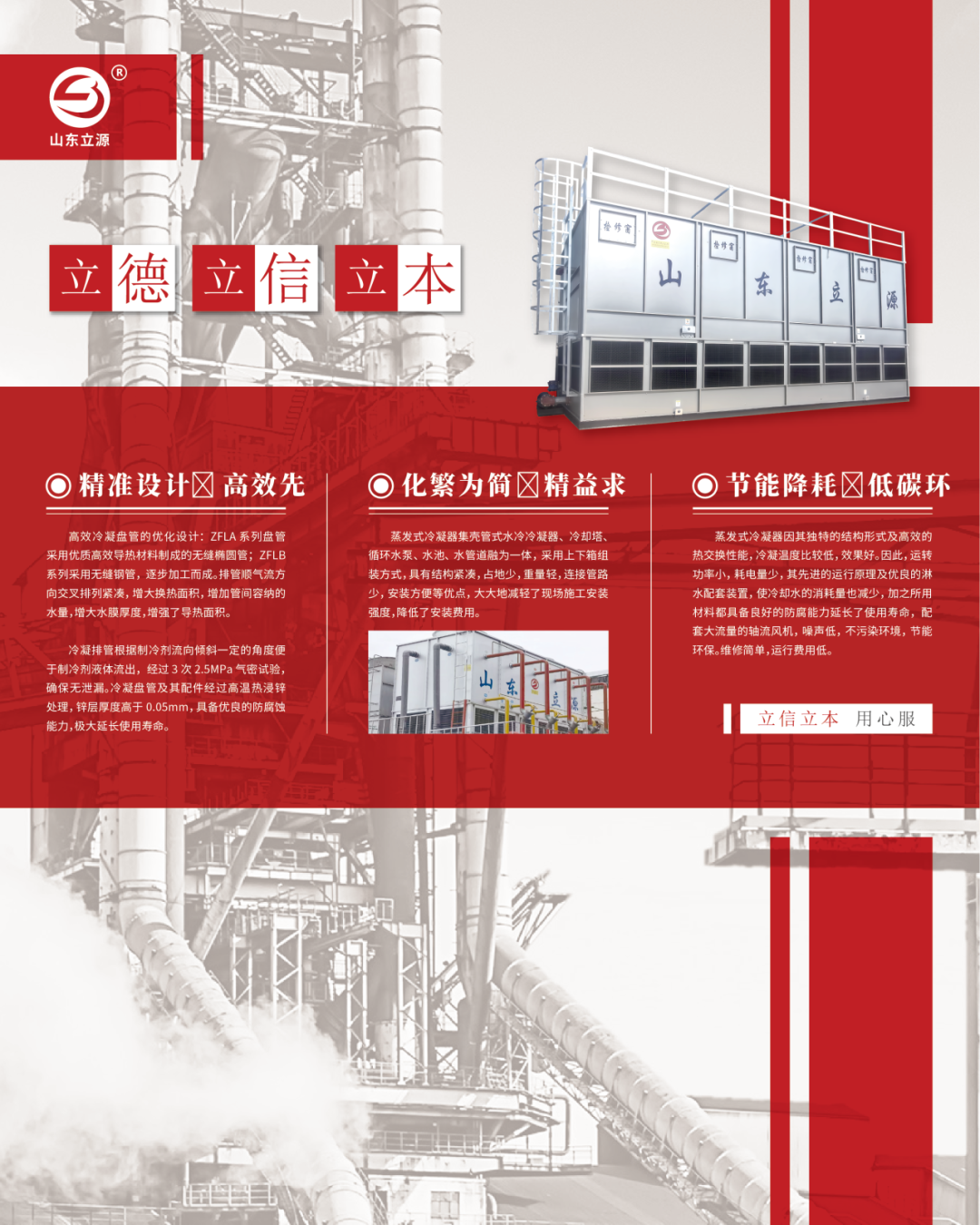 山东立源智能冷却系统有限公司是与北京、天津、上海、西安各大院校联合研发、设计专业从事换热、制冷设备生产制造的知名企业。主要生产换热设备、氨、氟制冷设备;蒸发式冷凝器、空气冷却器(冷风机)、一、二类压力容器、产品广泛应用于水利水电、核电、地铁、隧道、化工制药、煤矿、食品冷冻冷藏等众多领域。公司地理位置优越,坐落于山水之乡一山东省薛城经济开发区,公司占地60余亩。