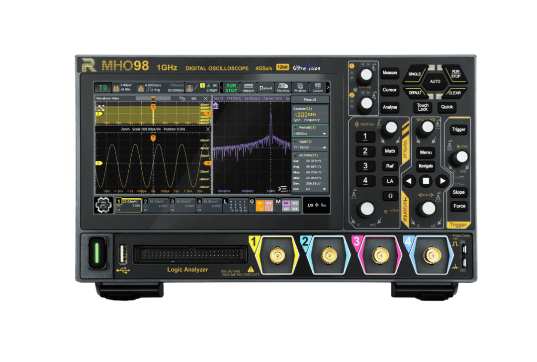 MHO98极客版超便携高分辨率示波器是RIGOL超便携家族的全新成员,实现了最高1GHz模拟带宽、4GSa/s实时采样率以及500Mpts存储深度。除强大的硬件指标外,它不仅支持16个数字通道,只需要一台设备即可对模拟和数字信号分析,满足嵌入式设计和测试应用,并且以入门级价格提供自动串行和并行总线分析,伯德图分析等功能,满足研发、教育、科研等领域的日常所需,在紧凑便携的机身中集成了丰富功能,为工程师带来极致的测试体验。