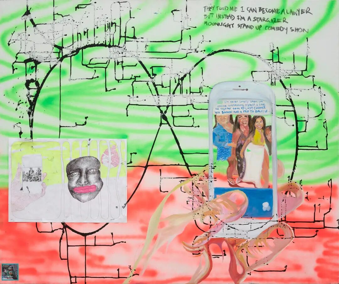 布面油画、喷漆、墨汁、铅笔和墨水