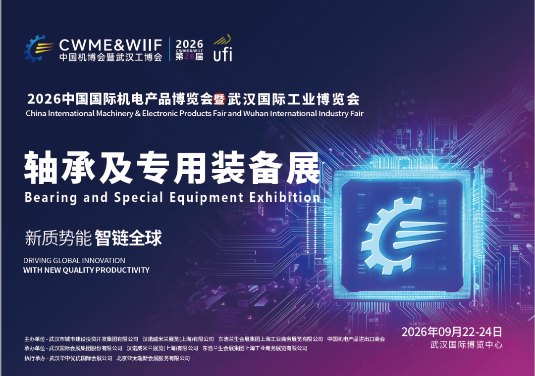 为加快轴承产业发展与科技创新,推动装备制造业高质量发展,2026武汉国际轴承 博览会,作为“2026中国国际机电产品博览会暨武汉国际工业博览会”的核心主题展, 将于9月22-24日在武汉国际博览中心隆重举办。展会立足中部市场,以“精准承载,驱 动未来”为主题,旨在全面展示从轴承钢、零部件到成套轴承、检测设备的最新产品与技 术,打造一个集品牌展示、技术交流、贸易合作于一体的专业平台。汇聚全球产业精英, 共同突破技术瓶颈,优化供应链生态,助力中国高端装备制造业的转型升级。专业观众 覆盖汽车制造、工业自动化、机器人、智能装备、航空航天、轨道交通、电子电器、能源电 力、工程机械等领域