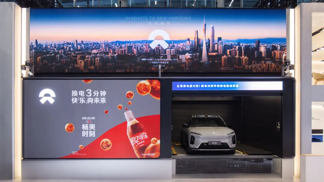 展台另一侧,蔚来与可口可乐联手打造的联名主题换电站赚足了眼球。为庆祝全国换电总量突破9000 万次,现场不仅展示了 “换电 3分钟快‘乐’向未来” 的便捷补能体验,还向观众免费派送蔚来限定款可乐,让原本偏技术化的补能场景,多了几分生活温度与趣味性。