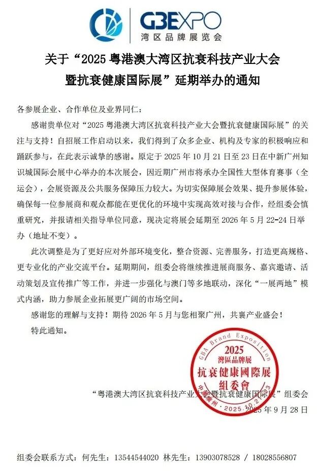 感谢贵单位对“2025粤港澳大湾区抗衰科技产业大会暨抗衰健康国际展”的关注与支持!自招展工作启动以来,我们得到了众多企业、机构及专家的积极响应和踊跃参与,在此表示诚挚的感谢。原定于2025年10月21日至23日在中新广州知识城国际会展中心举办的本次展会,因近期广州市将承办全国性大型体育赛事(全运会),会展资源及公共服务保障压力较大。为切实保障展会效果、提升参展体验,确保每一位参展商和观众都能在更优化的环境中实现高效对接与合作,经组委会慎重研究,并报请相关指导单位同意,现决定将展会延期至2026年5月22-24日举办(地址不变)。