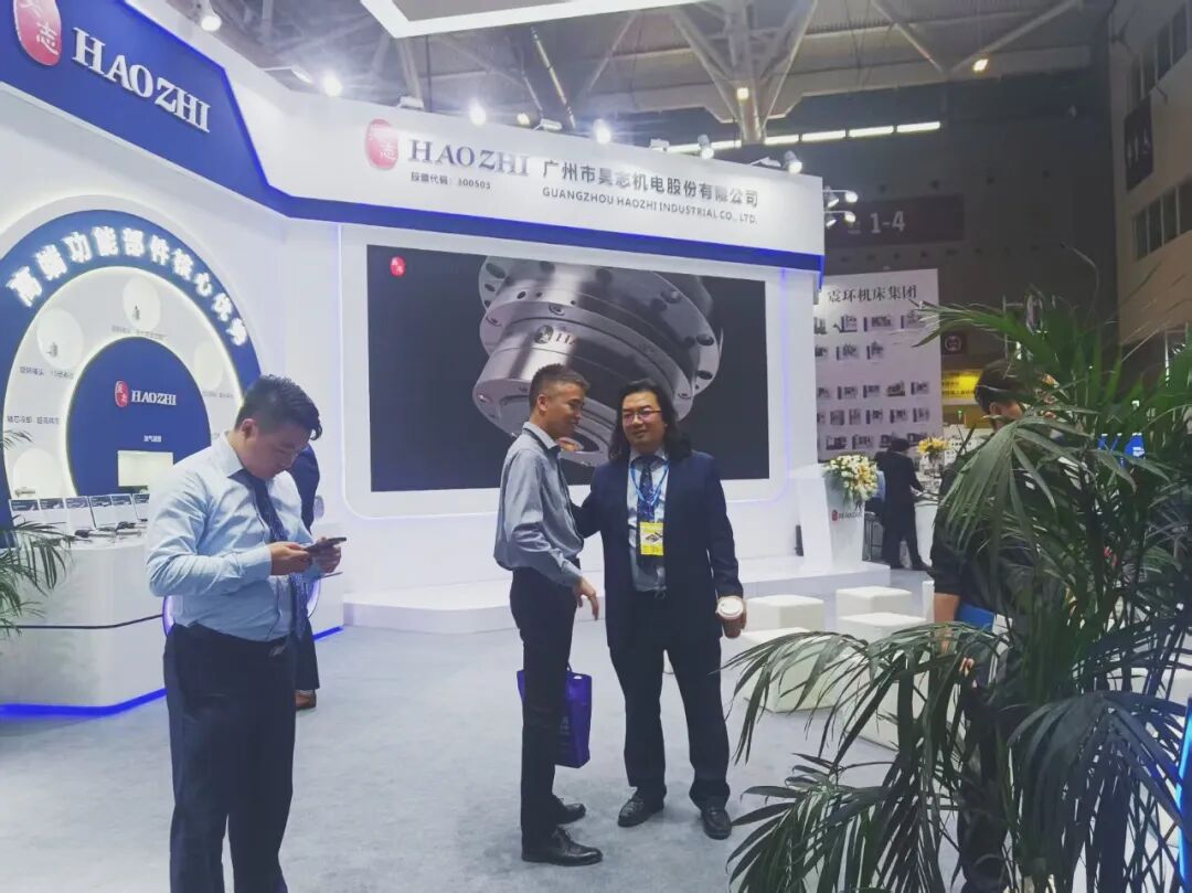 副会长单位昊志机电展示出了电主轴、转台、工业协作机械臂、自动化夹具等产品,孟治国总监和客户相谈甚欢。
