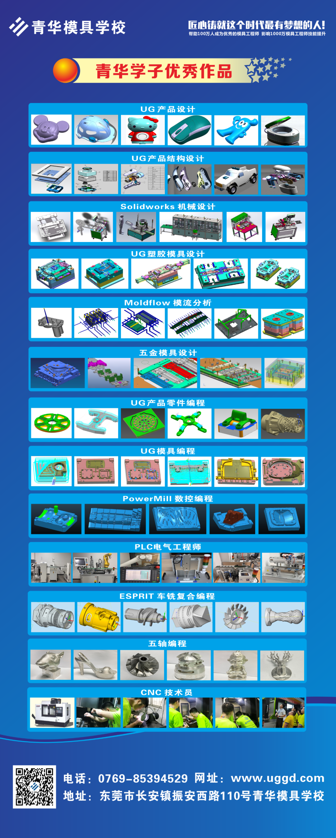 青华22年历程,专注于UG技术服务,用心打造专业的模具实战培训机构,常年开设UG产品设计、UG产品编程、UG模具设计、UG模具编程、五轴编程、PowerMILL编程、五金模具设计、SolidWork。