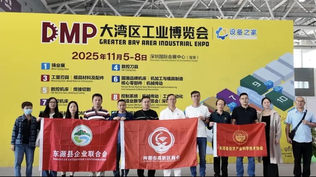 为进一步促进河源企业对接大湾区先进制造资源、加速数字化转型步伐、拓宽技术合作与市场发展渠道。2025年11月6日,东源县企业联合会携手河源市高新区商会、东源县经济产业科学技术协会,精准组织 20 余位本土装备制造、精密加工、电子元器件等领域的企业代表,赴深圳国际会展中心(宝安新馆)参观2025DMP 大湾区工业博览会(以下简称“工博会”)。