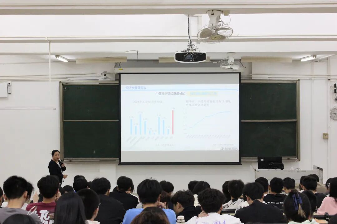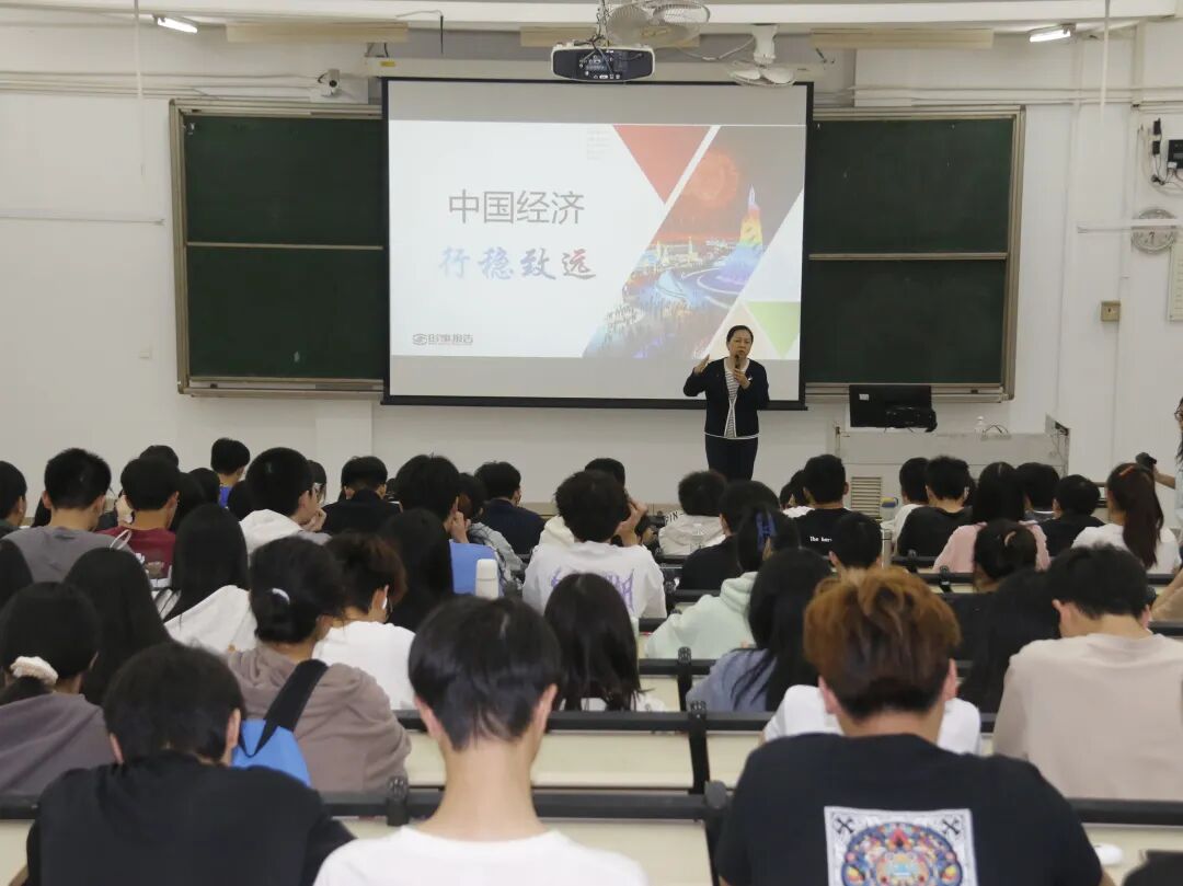 宋玉宏院长通过讲述我国近年来经济发展的成就以及面临的困难与挑战,引入我国经济制度的优势、五对关系的统筹(有效市场和有为政府、总供给和总需求、培育新动能和更新旧动能、做优增量和盘活存量、提升质量和做大总量)、改革开放的成功,向同学们多角度讲述了为何中国经济能行稳致远,并表示青年人才要充分认识到,我国经济发展势头足、亮点多、贡献大,所具有的稳定态势和深层优势没有变,发展的底气没有变。新时代青年应在风雨洗礼中成长,在历经考验中壮大,在推进中华民族伟大复兴进程中奉献青春和智慧,克服挑战和压力,不断迈上新台阶。